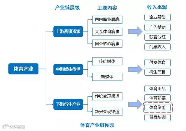 体育产业所涉及的产业十分广泛,主要分为核心层、外围层和相关产业层,分别对应着体育产业链的上游赛事资源、中游媒体传播和下游衍生产业。