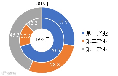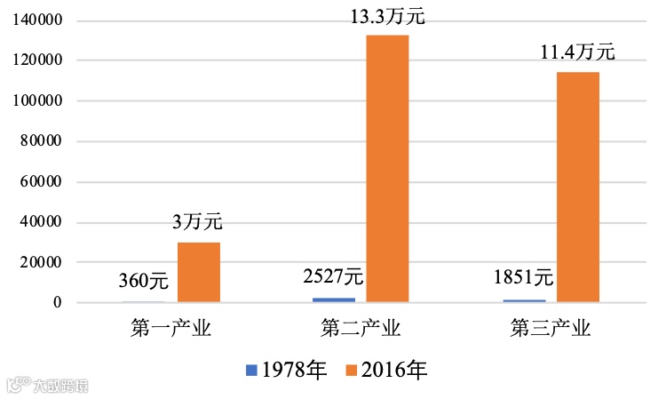 2016年,第一、二、三产业人均创造产值比例约为1:5:4,从业人员的比例为1:1:1.6,从业人员结构比1978年有明显改善,极大提高了整个社会的劳动生产率。