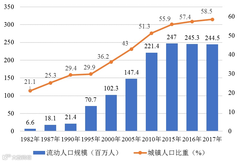 △ 1982-2017年全国流动人口规模(单位:百万人,%)