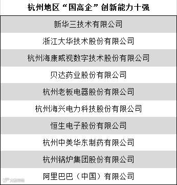 强中择优,最强代表团的杭州“国高企”中,新华三技术有限公司、浙江大华技术股份有限公司、杭州海康威视数字技术股份有限公司、贝达药业股份有限公司、杭州老板电器股份有限公司、杭州海兴电力科技股份有限公司、恒生电子股份有限公司、杭州中美华东制药有限公司、杭州锅炉集团股份有限公司、阿里巴巴(中国)有限公司,分别位列地区创新能力十强。