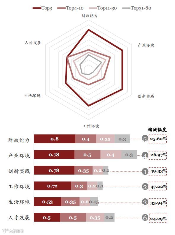 而创新实践、生活环境、工作环境在不同梯度的城市间缩减幅度最大,表明各个城市在这三方面差异明显,发展不平衡。
