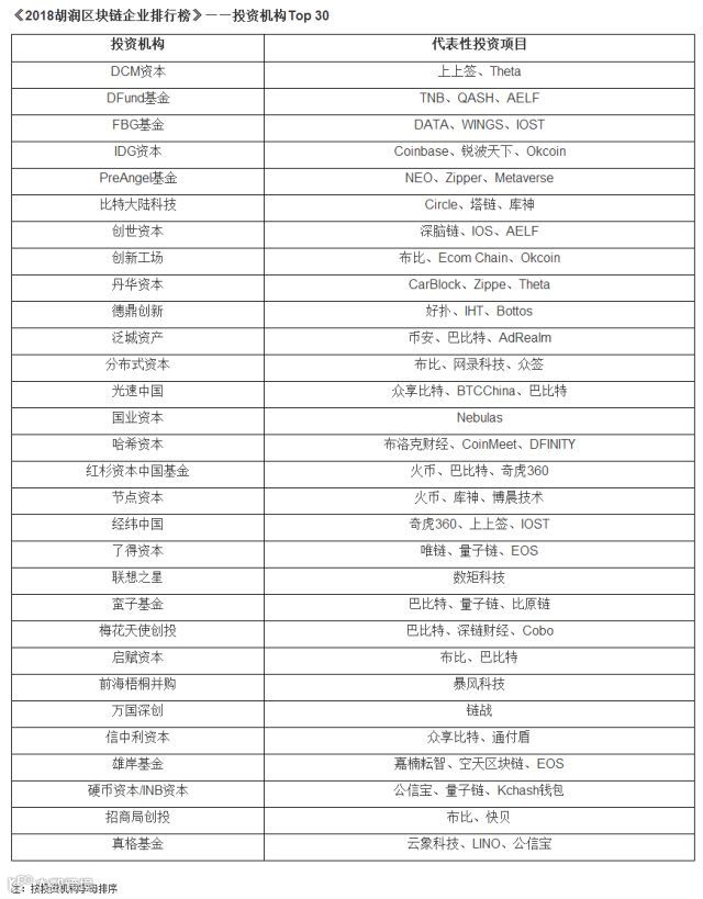 胡润区块链投资机构Top 30的上榜机构为合法持相关牌照的基金或投资公司,并已投资区块链相关项目,在业内享有一定声誉,区块链项目及实体应用的质量领先于其他投资机构。