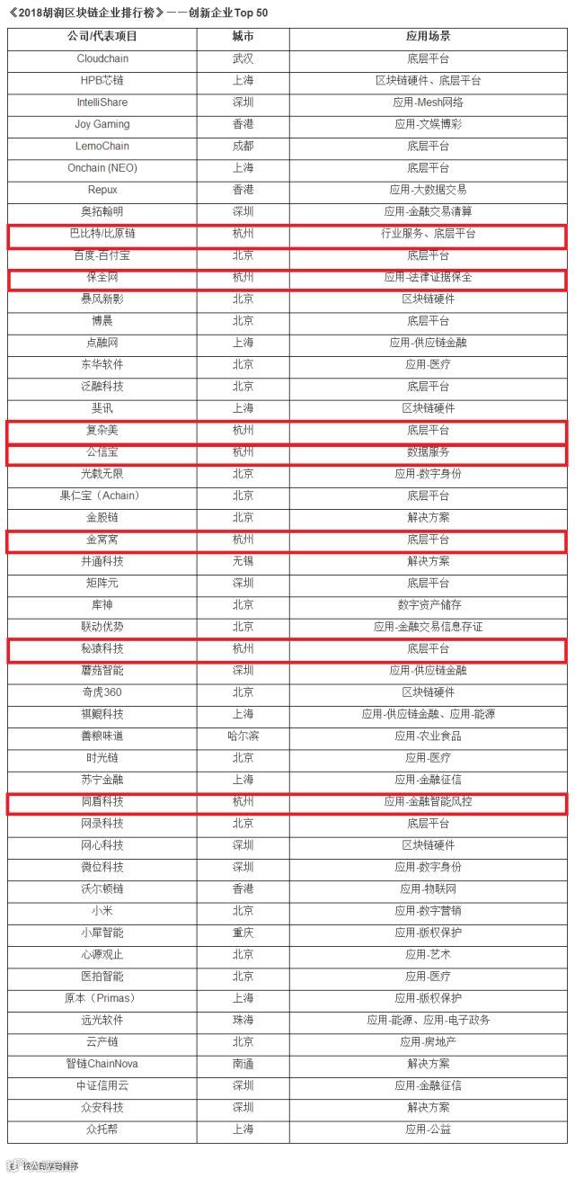 杭州上榜企业为巴比特/比原链、保全网、复杂美、公信宝、金窝窝、秘猿科技、同盾科技等七家。