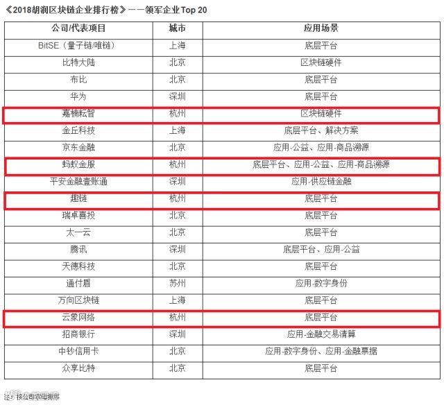 杭州上榜企业为嘉楠耘智、蚂蚁金服、趣链、云象网络等四家;此外,注册于上海的万向区块链也进入TOP20榜单。