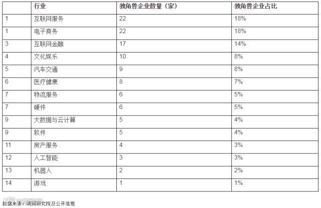 从行业维度看,来自于互联网服务及电子商务行业的独角兽最多,各有22家企业上榜,在14个行业中并列第一,互联网金融行业涌现出17家独角兽企业,前三大行业的独角兽占到上榜独角兽企业总数的50%。