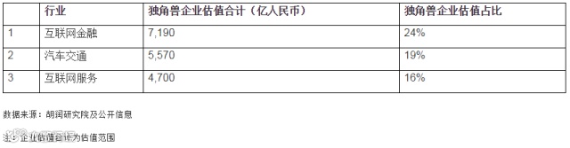 与此同时,互联网金融独角兽企业总估值在各行业中异军突起,以超7000亿人民币占据首位;汽车交通行业紧随其后,以超过5000亿人民币的总估值位列第二;互联网服务行业独角兽企业总估值排在第三。
