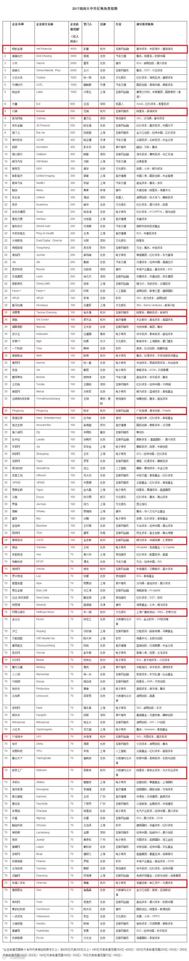 2017大中华区独角兽企业Top10