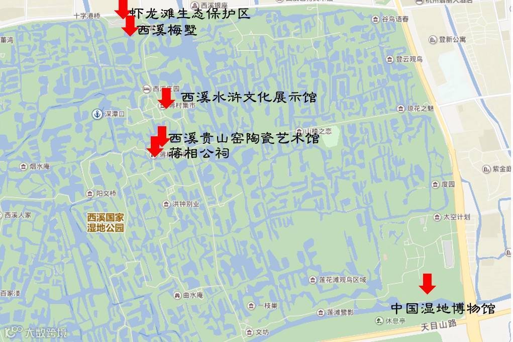 线路推荐:西溪湿地——中国湿地博物馆——西溪水浒文化展示馆——西溪贵山窑陶瓷艺术馆(国宴瓷器)——蒋相公祠——虾龙滩生态保护区——西溪梅墅