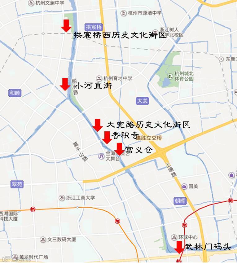 路线推荐:武林门码头——拱宸桥西历史文化街区——小河直街——大兜路历史文化街区——富义仓——香积寺