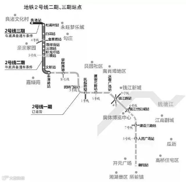 地铁2号线一期东南段已于2014年11月24日正式运营 ,一期西北段于2017年7月3日建成通车。2号线全线贯通后,将把萧山副城、市中心商业区、城西大型居住区、良渚生活区都串联在一起,从朝阳站至良渚站全线单程列车运行时间平均为77分钟。