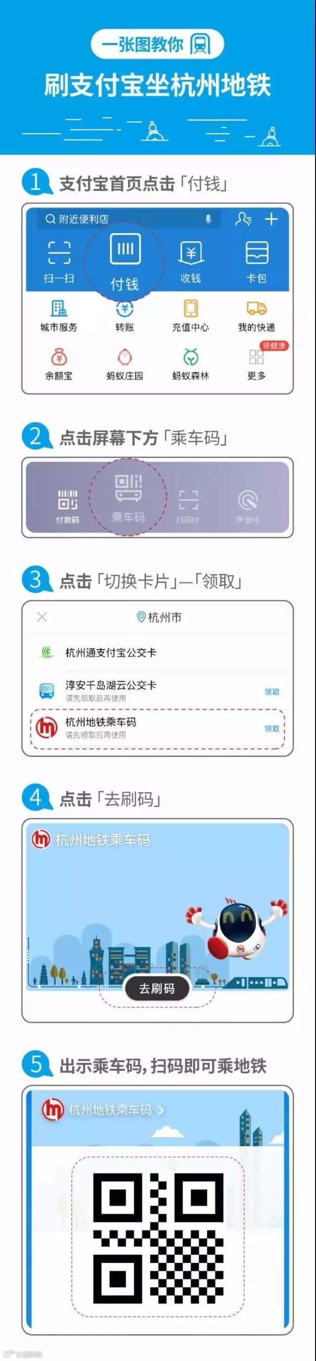 首次使用手机二维码刷码过闸需要先领卡(明天17:00后可以操作)。领卡后乘坐地铁时,打开手机杭州地铁官方APP,在首页点击“乘车码”;或打开支付宝APP,在首页点击“付钱”,页面底部选择“乘车码”,将乘车二维码对准地铁闸机扫描口,扫码进站;用同样的方法扫码出站。