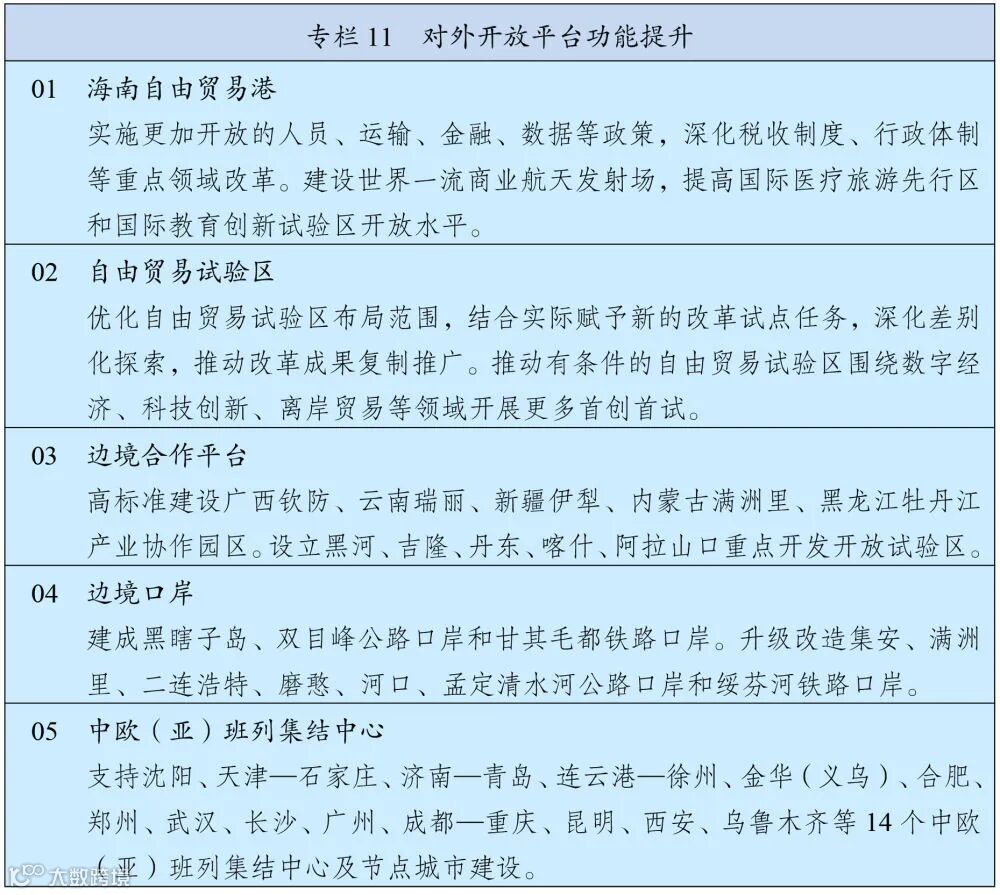 打造形态多样的开放高地,加快形成陆海内外联动、东西双向互济的全面开放格局。高标准建设海南自由贸易港,高水平实施全岛封关运作,持续提升贸易投资和要素流动等重点领域开放水平,逐步构建与高水平自由贸易港相适应的政策制度体系。实施自由贸易试验区提升战略,开展更大力度制度型开放试验,提升创新引领发展能级。统筹布局建设科技创新、服务贸易、产业发展等重大开放合作平台,支持功能相近、区位相邻的平台优化整合,推动国家级新区、开发区管理制度和运营模式创新,促进综合保税区转型升级,推进沿边重点开发开放试验区、产业协作园区、沿边临港产业园区和边(跨)境经济合作区等建设。