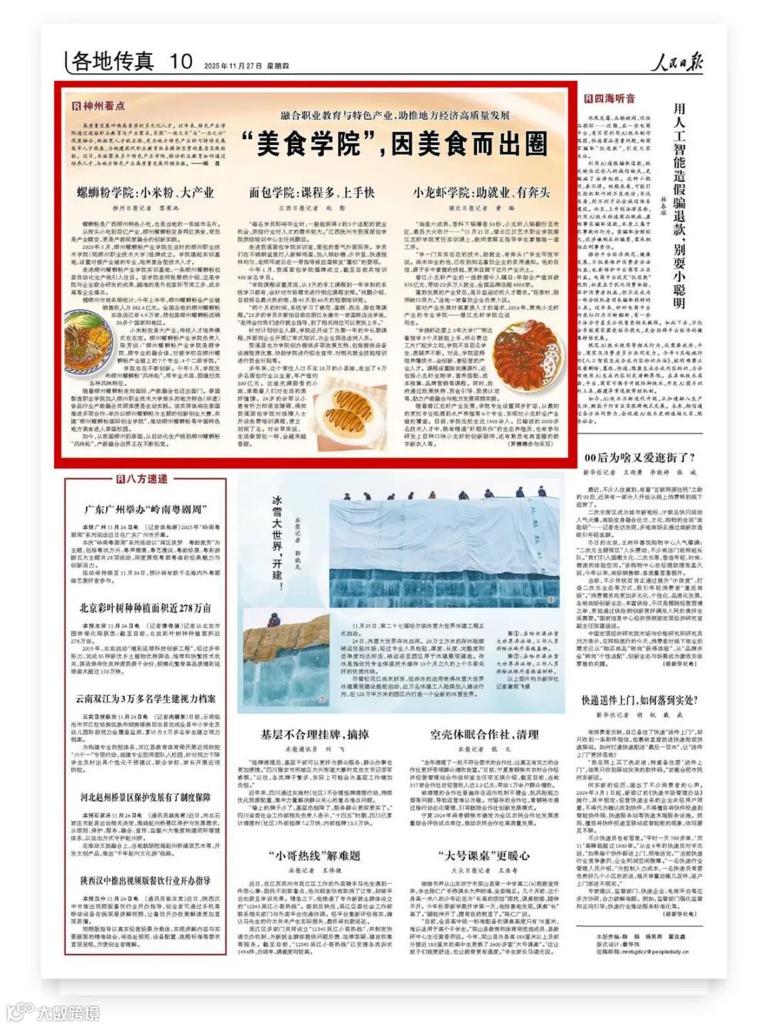 11月27日,人民日报10版头条发布柳州市融媒体中心记者采写的文章《螺蛳粉学院:小米粉、大产业》,关注了柳州产教深度融合的创新实践,与地方特色产业高质量发展同频共振。全文如下: