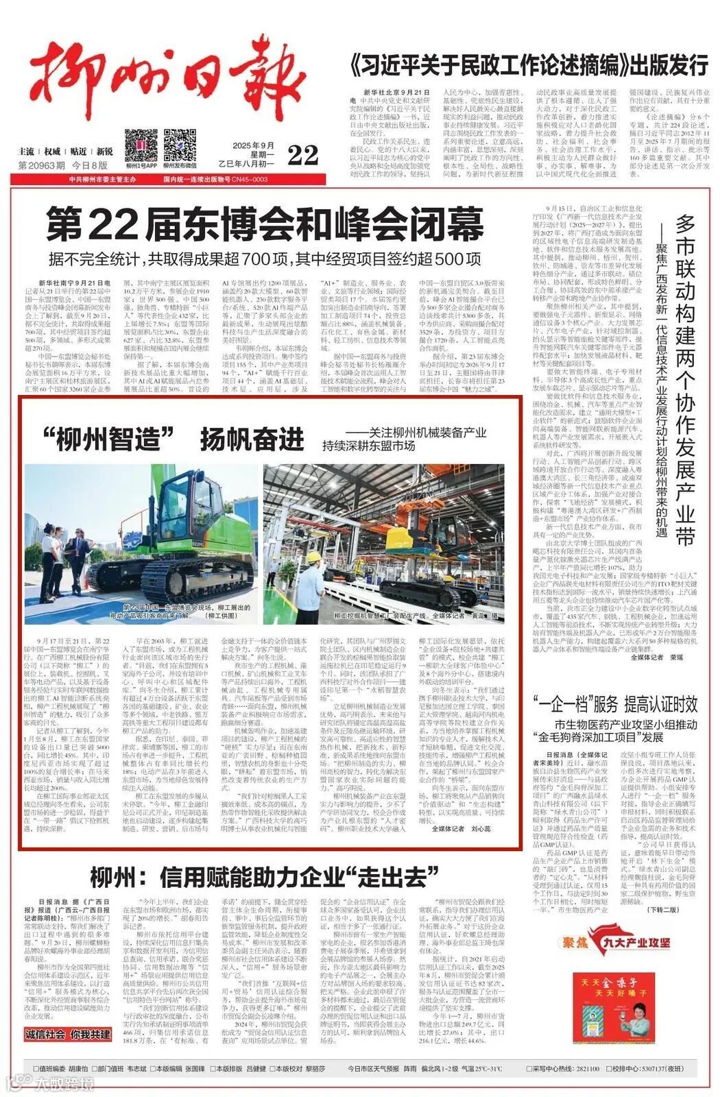 9月22日,《柳州日报》头版刊发相关报道。