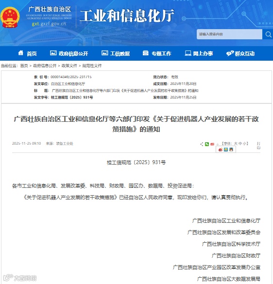 11月25日,广西工业和信息化厅等六部门印发《关于促进机器人产业发展的若干政策措施》,明确以南宁、柳州为核心培育机器人产业集群,支持南宁打造机器人出口基地,柳州建设机器人应用场景创新及整机零部件制造基地。
