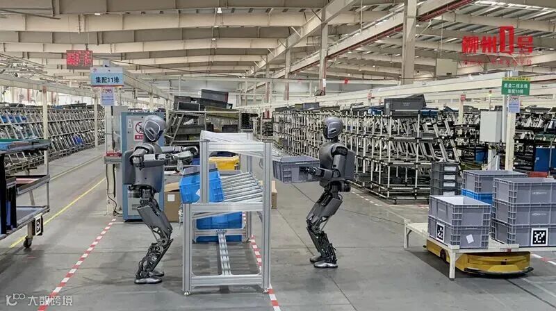 记者在东风柳汽商用车智能制造工厂看到,一台优必选人形机器人正用“手”抓取物料并放入物料箱,另一台人形机器人则将物料箱放置于无人物流车上。紧接着,无人物流车便将物料箱运送至对应的装配工位。