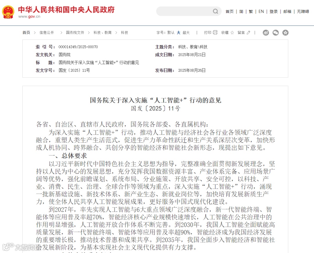 日前,国务院印发的《关于深入实施 “人工智能 +” 行动的意见》,为全国人工智能产业发展铺就了宏伟蓝图。