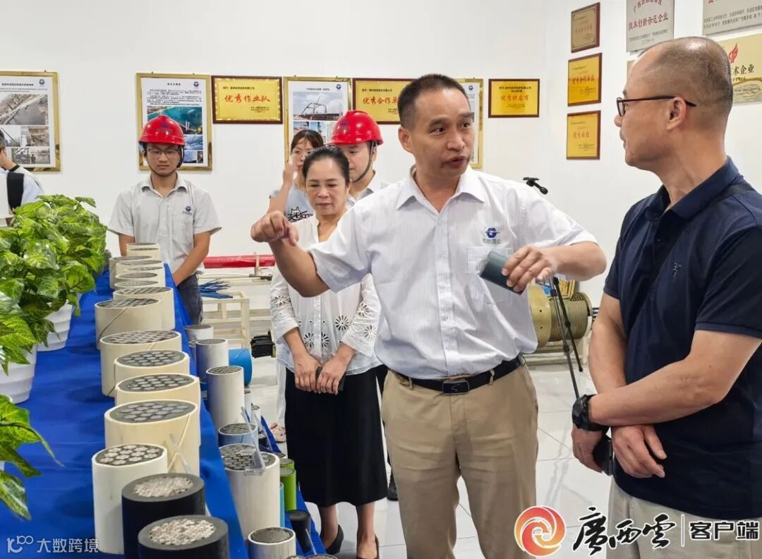 柳州桂桥缆索有限公司董事长苏桥(右二)介绍缆索的生产过程。