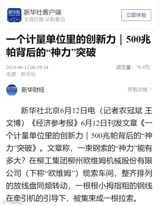 一束钢索的“神力”能有多大?在柳工集团柳州欧维姆机械股份有限公司(下称“欧维姆”)缆索车间,整齐排列的放线盘同频转动,一根根小拇指粗的钢线在牵引机的引导下,被集束成一根拉索。