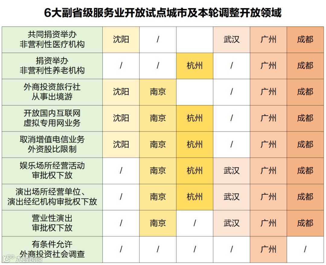 从本次法规调整的城市来看,广州是唯一一个实现全覆盖的城市,特别是允许外商投资社会调查,为广州独家试点。