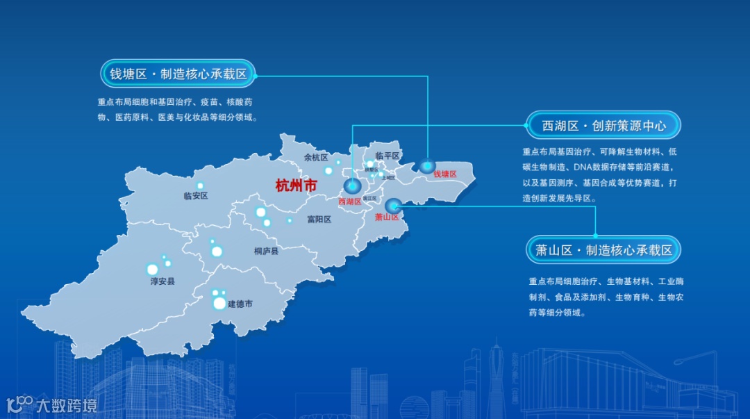 根据规划,杭州将形成“一心双核多元”产业空间布局,即以西湖区为创新策源中心,以钱塘区和萧山区为制造核心承载区,以余杭区、临平区、拱墅区、滨江区、临安区、建德市等区域为多元协同发展区,构建合成生物学科技创新和产业创新融合发展的百亿级“雁阵”。
