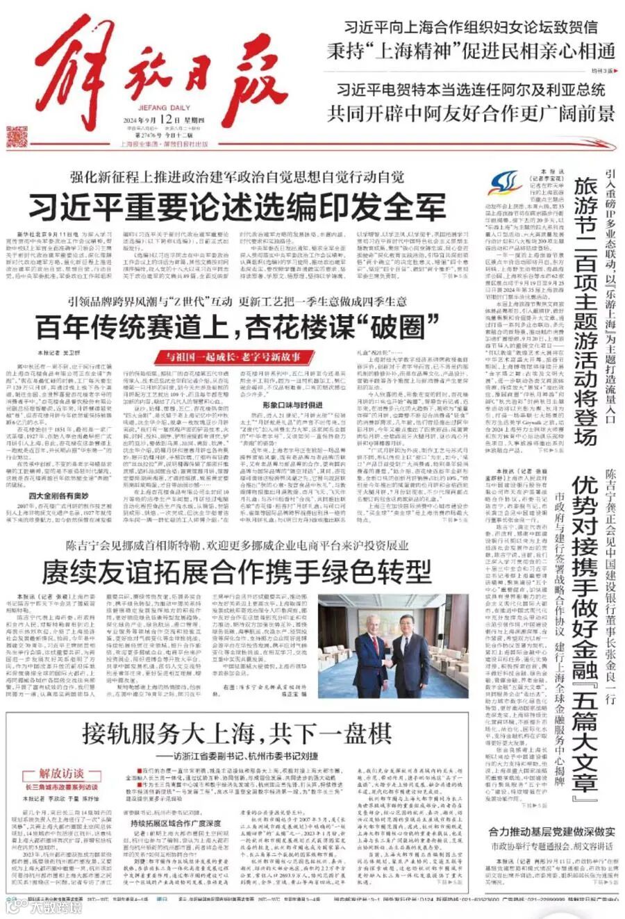 近日,《解放日报》头版刊发《接轨服务大上海,共下一盘棋——访浙江省委副书记、杭州市委书记刘捷》一文。