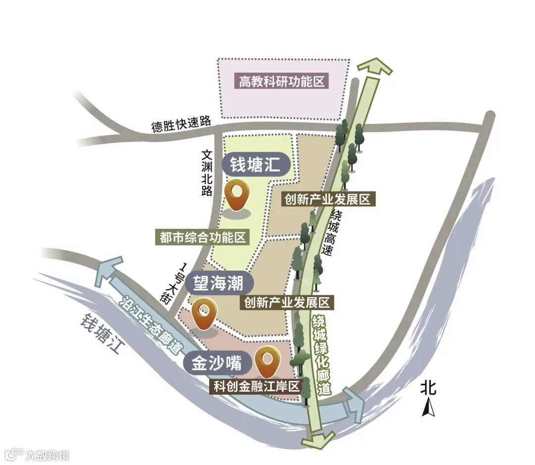 核心区域的取名充满杭州的人文气息——1号大街附近将打造集聚数字产业的创新基地和产城互融的示范社区,建设国际人才科创厅,名为“钱塘汇”;沿江南部,是离钱塘江最近的“望海潮”,与文化消费综合体相接,也将是东部湾新城的繁华之地;沿江东部,将重点招引总部企业,规划打造“超级总部中心”,未来,“金沙嘴”将是新一代总部集聚区杭州新名片。