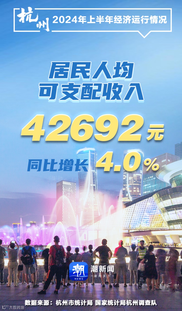 消费要修复,就要增加居民收入。上半年,杭州居民人均可支配收入42692元,同比增长4.0%,基本与GDP增速同步。