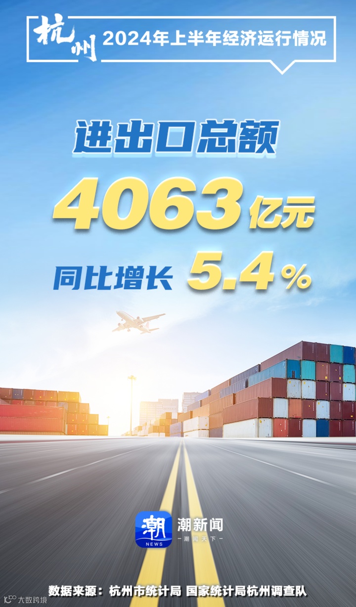 上半年,杭州货物进出口总额4063亿元,同比增长5.4%;其中出口2739亿元,增长5.6%。