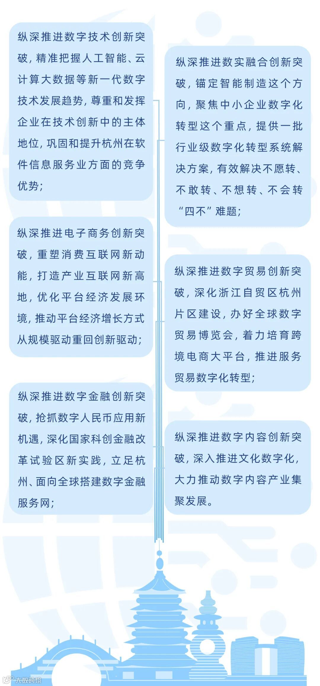 其中着重强调了未来杭州数字经济发展要重点发力“纵深推进”的六个方向,分别为数字技术、数实融合、电子商务、数字贸易、数字金融与数字内容。