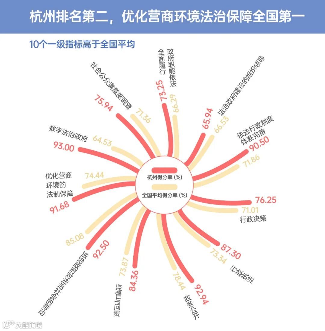 自2013年起,中国政法大学法治政府研究院启动了中国地方法治政府评估项目,至今已持续10年。本年度选择了100个城市为评估对象,覆盖一线、新一线和部分三四线城市,从政府职能依法全面履行、依法行政制度体系的完善、优化营商环境的法治保障、数字法治政府等11个方面,对地方法治政府建设水平进行评估。在这11项指标中,杭州有10项指标得分率高于全国平均水平,且在优化营商环境法治保障指标得分全国第一。