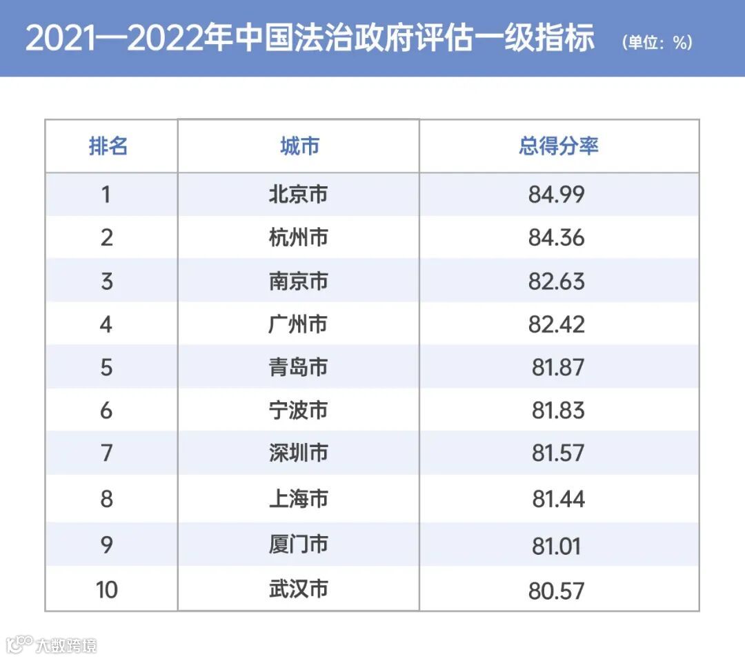 近日,中国政法大学法治政府研究院发布《中国法治政府评估报告(2021-2022)》(以下简称《报告》),在国内100个城市的法治政府建设情况评估中,杭州以84.36%的总得分率排名全国第二。