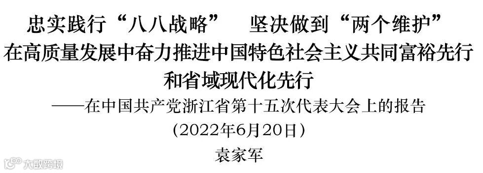 同志们!新征程已经开启,新蓝图催人奋进。我们要更加紧密地团结在以习近平同志为核心的党中央周围,高举伟大思想旗帜,忠实践行“八八战略”,坚决做到“两个维护”,在高质量发展中奋力推进中国特色社会主义共同富裕先行和省域现代化先行,以实际行动迎接党的二十大胜利召开,为实现第二个百年奋斗目标、实现中华民族伟大复兴的中国梦作出新的更大贡献!