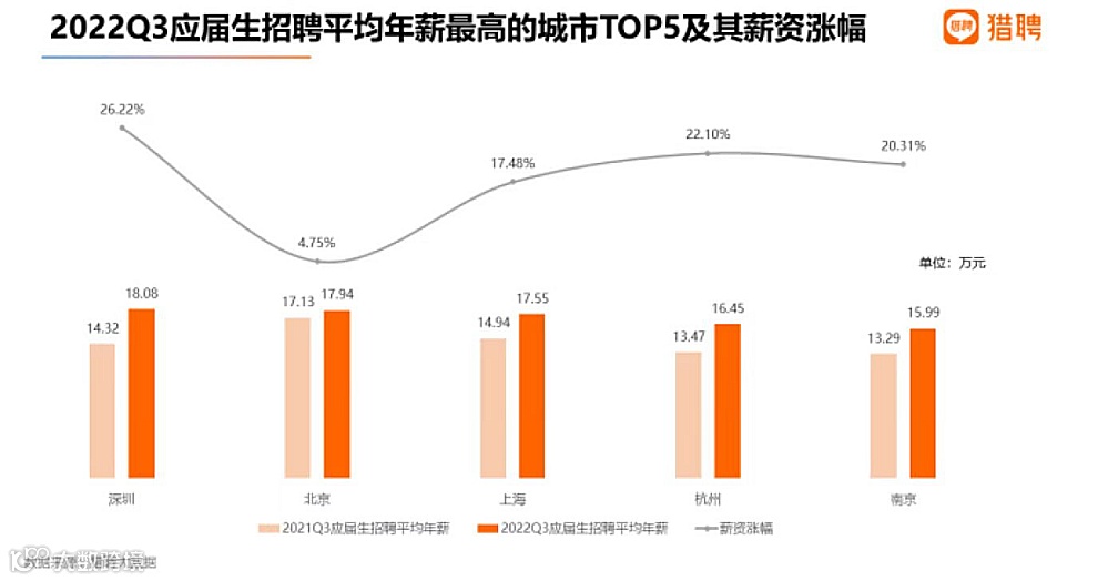报告显示,从应届生职位招聘薪资来看,深圳、北京、上海、杭州、南京分别以18.08万、17.94万、17.55万、16.45万、15.99万位居TOP5城市。