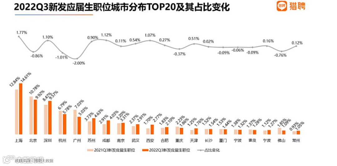 报告显示,从2022三季度新发应届生职位城市分布TOP20来看,杭州三季度新发应届生职位占比5.78%,紧随上海、北京、深圳之后,位居全国第四,新一线城市之首,正展现出较为旺盛的人才需求。