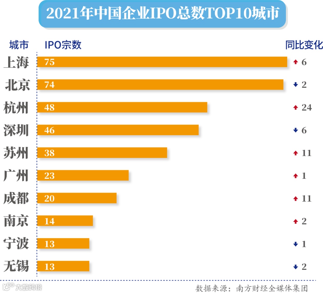 对比来看,2020年排名第5的杭州,2021年超越深圳,跃居全国第三位。过去的一年里,杭州IPO企业数量增长了一倍,从2020年的24家增加到2021年的48家,IPO企业数量增加量排名全国首位。