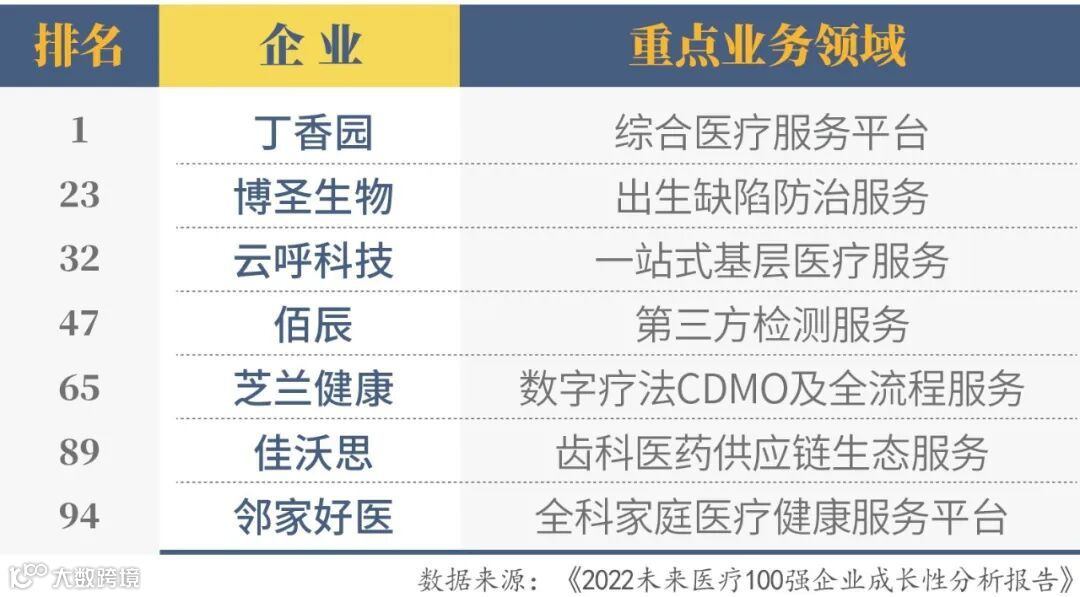 近日,VB100、动脉网、蛋壳研究院联合发布2022年未来医疗100强系列榜单,在医疗服务、数字医疗、医疗器械、生物医药四大领域分别评选出估值排名Top100的创新企业。