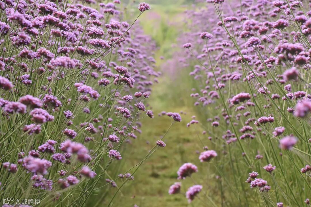 其中,占地80亩的马鞭草正值花期。夏风吹过,马鞭草起伏摇摆,犹如紫色的浪花,一片片荡漾开来,浪漫而热烈。