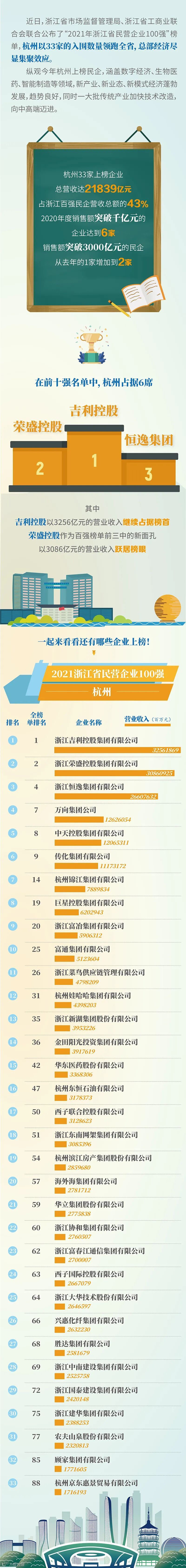 2021浙江民营企业百强榜发布!杭州33家企业上榜,前十强占六席!
