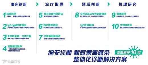 凭借“诊断技术研发及产品生产+医学诊断服务+健康管理”三位一体的综合优势,目前迪安诊断针对新冠病毒诊疗推出了“四段十招”整体化解决方案,为有效应对疫情发展并做好常态化防控贡献了专业力量。