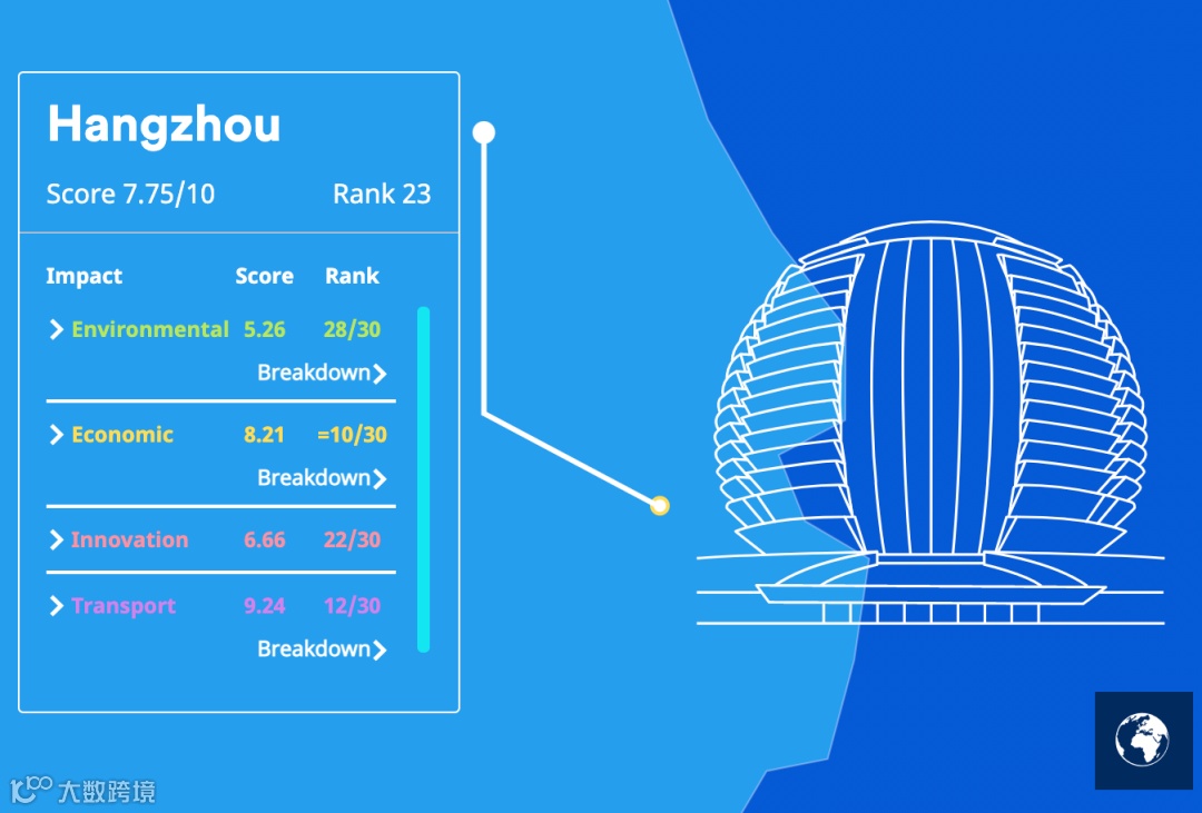 具体指标上,杭州在经济上获得8.21分,排名全球第十位,其余三项中环境5.26分、创新6.66分、交通9.24分,综合得分7.75分。