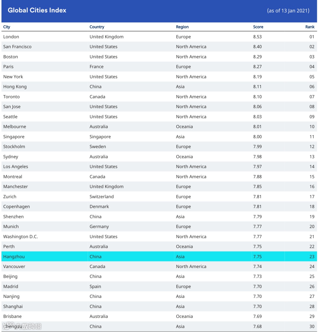 近期,全球资产管理公司Schroders发布了《2020全球城市指数报告》,对全球900多个城市进行了多维度的测评,最终评估出全球表现最佳的30个城市。根据报告,在7个上榜的中国城市中,杭州超过北京、上海,位列全球第23名。