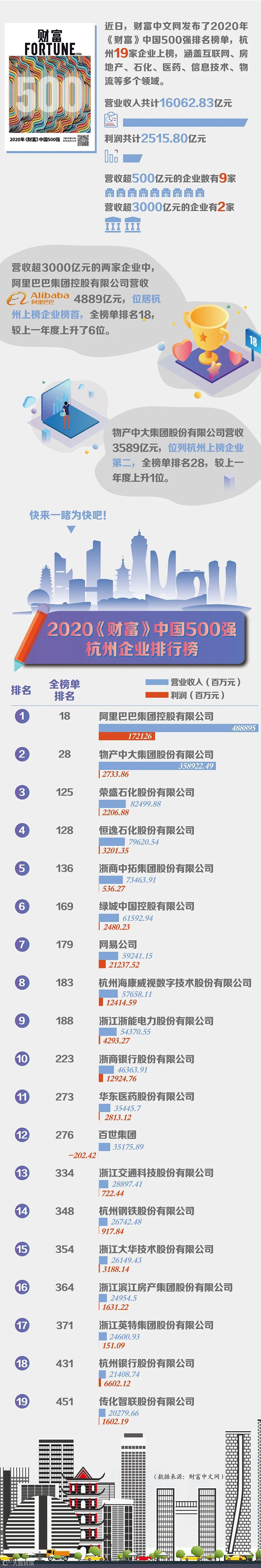 2020年《财富》中国500强榜单出炉!杭州19家企业上榜,有你熟悉的么?