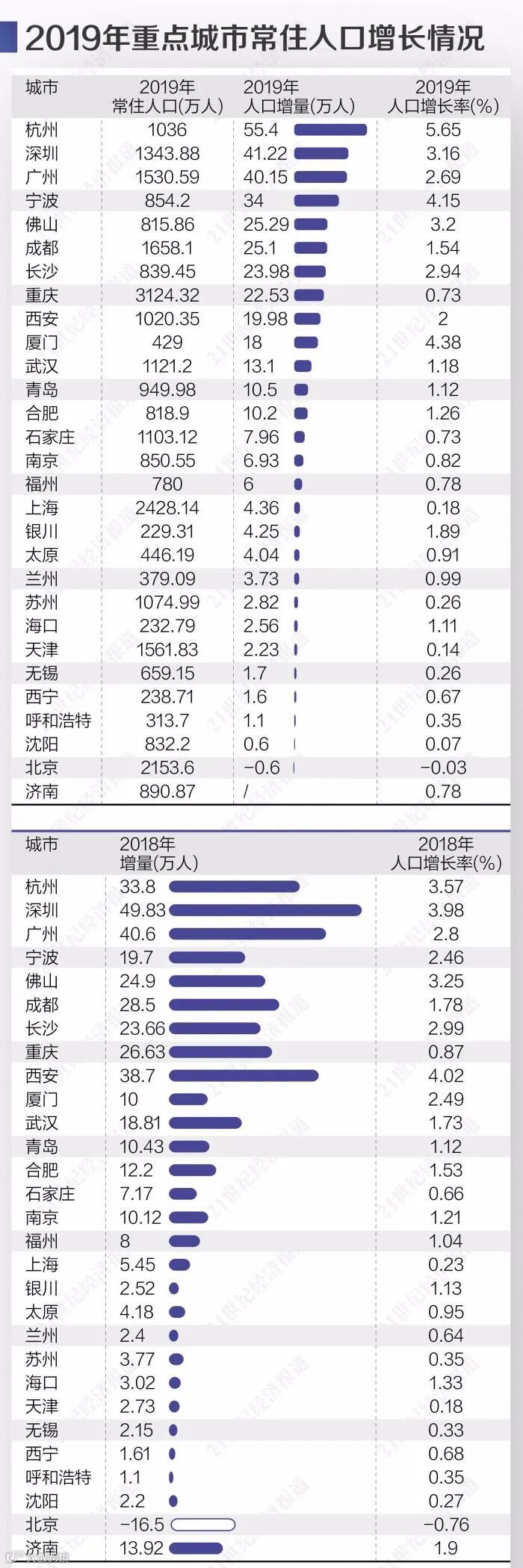 值得注意的是,杭州、厦门、宁波全面爆发,2019年常住人口增速大幅加快,但全国包括西安、深圳、武汉等20多个省会和重点城市则明显降温。