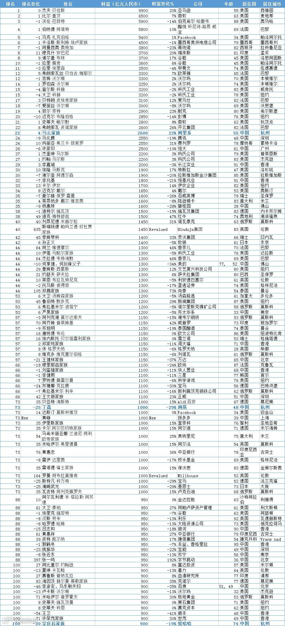 2019胡润全球富豪榜前100名