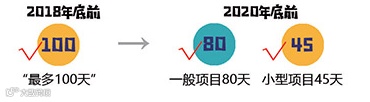 2018年底前,实现一般企业投资项目开工前审批“最多跑一次”“最多100天”;2020年底前,一般企业投资项目从赋码备案到竣工验收的审批时间压减至80天以内,小型项目压缩至45天以内。