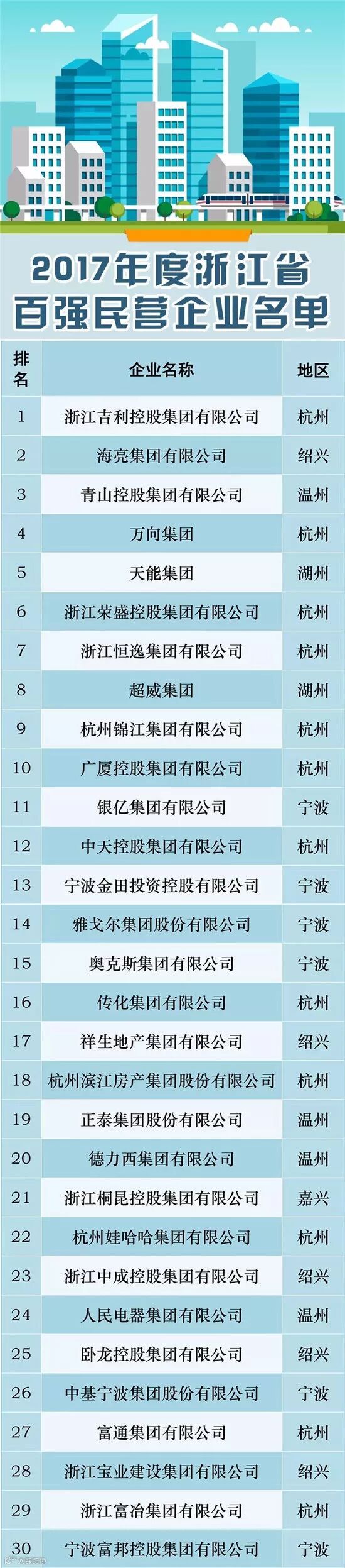 日前,浙江省工商局、浙江省工商联、浙江省民营企业发展联合会根据2017年度企业年报相关数据,以企业年度销售总额(营业收入)为主要依据,参考企业净资产、纳税额、净利润等指标,联合公布了“2017年度浙江省民营企业百强榜单”。