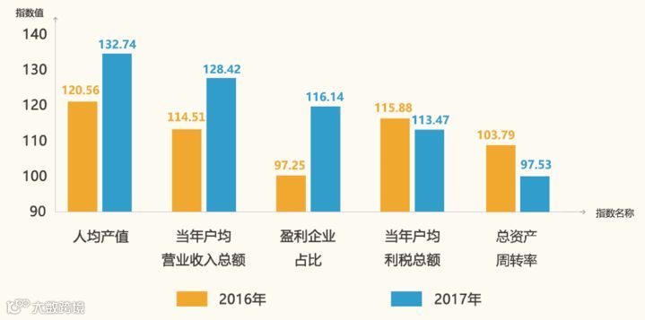 社会贡献度指数指标中,盈利企业占比增幅第一,人均产值、当年户均营业收入总额呈上升态势,当年户均利税总额、总资产周转率有所下降。