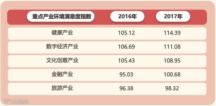环境满意度指数,健康、数字经济、文化创意产业居前三位。