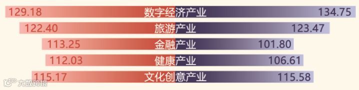 重点产业中,数字经济、旅游、文化创意产业指数居前三,指数值分别达到 127.90点、121.52点、120.03点,纺织服装业、化工、化纤、橡胶及塑料制造业发展趋于平缓。